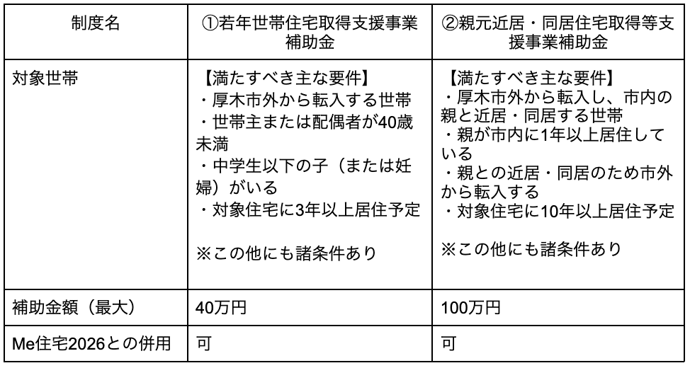 厚木市では、例年ファミリー層の定住や多世代同居を促進する制度が充実しています。中学生以下のお子様がいる世帯や、親世帯との近居・同居を考えている方は要チェックです。なお、①と②の制度は併用できません。また、いずれも予算に達し次第、受付終了となりますので、早めの検討をおすすめします。