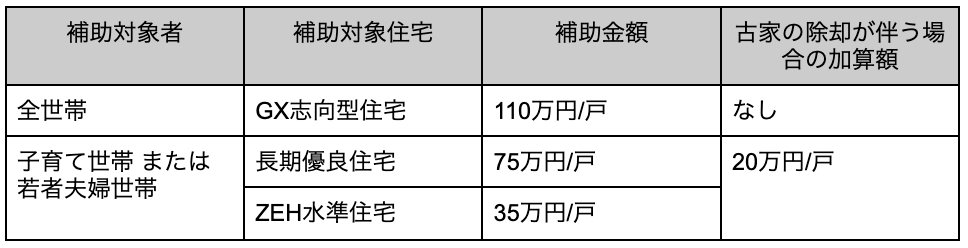 こちらも「子育て世帯」または「若者夫婦世帯」のみが対象です。補助額は年々縮小傾向にあり、今年度は35万円となります。性能面での快適性や入居後の経済性はGX志向型の方が優れているため、初期費用を抑えてZEH水準にとどめるか、予算を追加してGX志向型を目指すか、住宅会社と慎重にシミュレーションをして決めることをおすすめします。