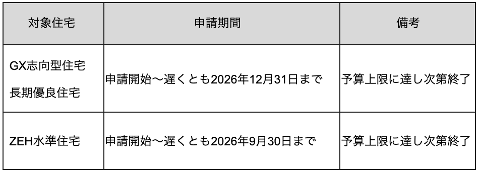 昨年度、「GX志向型住宅」の枠は予想を上回る早さで予算上限に達し、早期に受付終了となりました。今年度も同様に、早期終了の可能性があるため、「まだ期間はあるから大丈夫」と油断せず、なるべく早い段階での計画・申請をおすすめします。